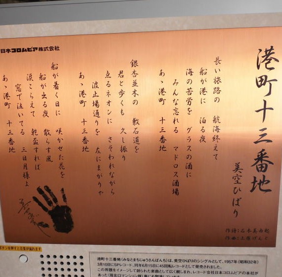 歌曲;港町十三番地は、美空ひばりが1957年(昭和32年)に発表した昭和を代表するマドロス物の歌でヒット曲です。 日本コロムビアの川崎工場が港町九番地でしたが、ゴロ良く作詞家が 「んばんち」としたそうです。